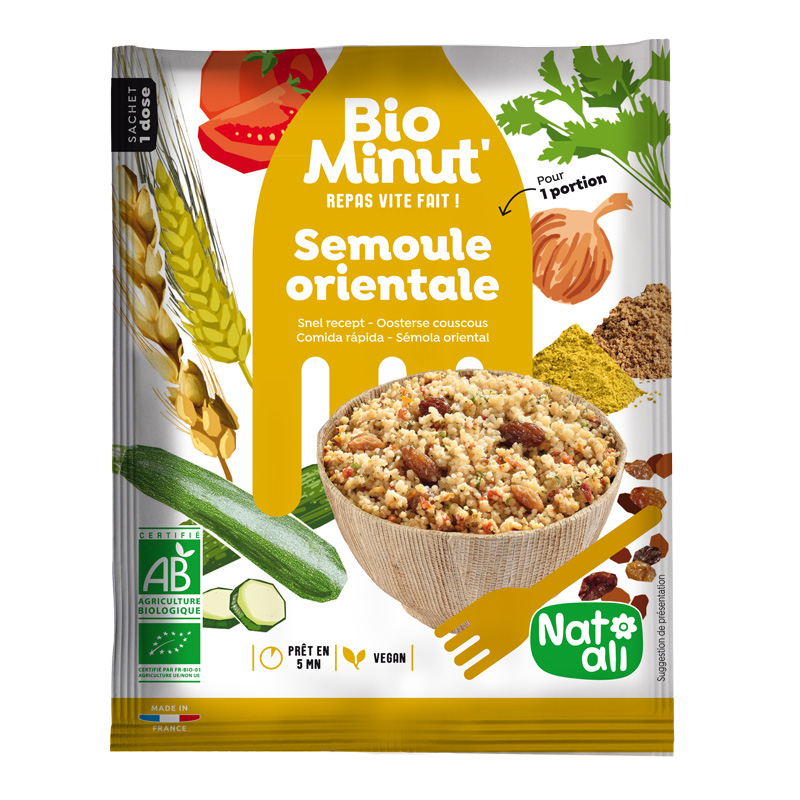 Couscous 4 céréales* 73% (semoule complète de blé*, farine complète d’épeautre*, farine complète de blé de khorasan*, farine de maïs*, eau), raisins secs* (raisins sultanines*, huile de tournesol*), légumes* (courgette*, tomate*, oignon*), flocons 5 céréales* (blé*, orge*, avoine*, seigle*, riz*), épices* (cumin*, coriandre*, ail*, poire noir*), sel de Guérande, persil*.